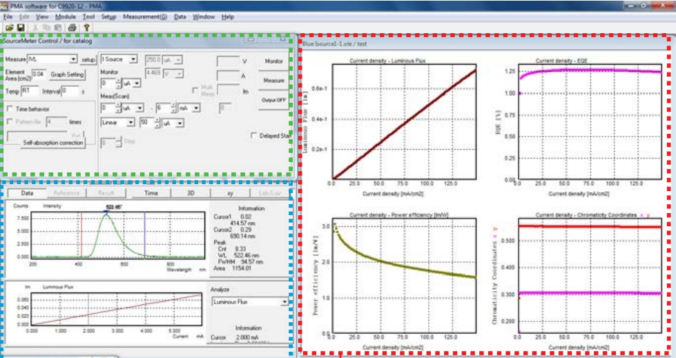 使用积分球能够独立于样品的发光角度特性测量 EQE;软件控制恒流电源;所施加电压/电流的每个步骤的光谱被瞬时测量(I-V-L 测量);冷却型 BT-CCD 可实现高灵敏度测量;易于处理且直观的软件,用于测量、计算和控制系统;显示多个变量的组合(电流、电压、发光效率、色度等);该系统可轻松扩展到PL 量子产率测量系统和光分布测量系统。