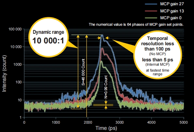10000:1 的高动态范围(时间分辨率为 100 ps 时);5 ps 的时间分辨率*;有效光阴极尺寸:17 mm;同时测量时间和空间(波长)轴上的光强。* 时间分辨率为 5 ps 时,条纹相机在zui快时间范围的动态范围为 1000:1。检测单个光电子需要图象增强器