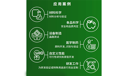 材料科学:材料分析与验证 | 食品科学:可靠和品质判定 | 设备制造:晶圆测试 | 医学制造:原料开发、识别与验证 | 自定义性能:可行性研究和原型开发 | 研发工作:为研发验证或特殊用途进行完全定制